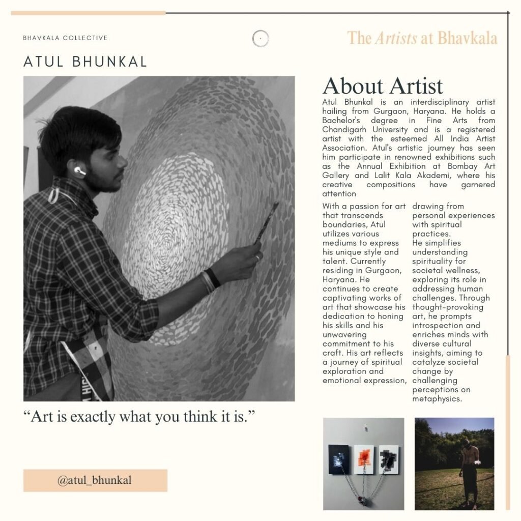 Atul Bhunkal is an interdisciplinary artist from Gurgaon, Haryana, whose formal training in Fine Arts from Chandigarh University, and worked with the Wilson Art Gallery and Museum in the UK.