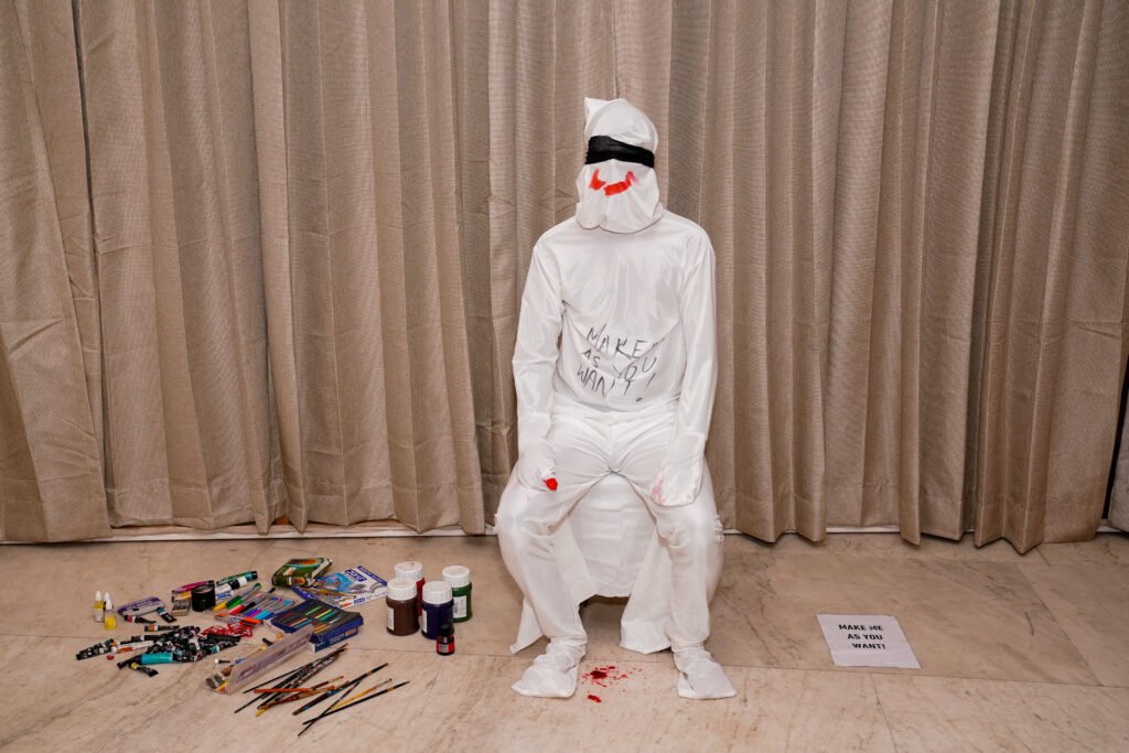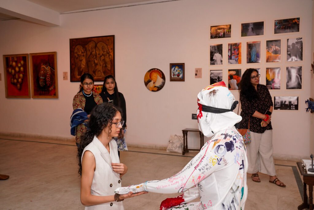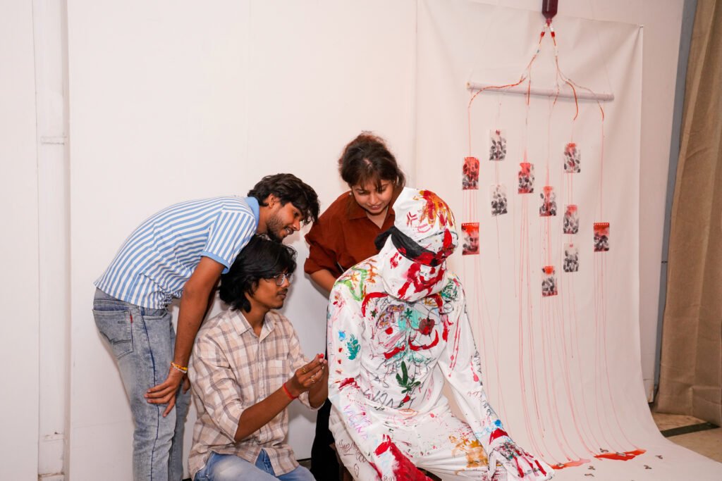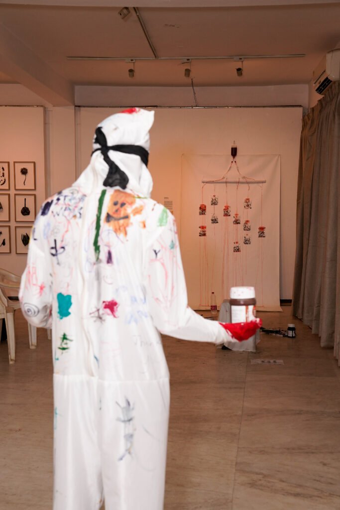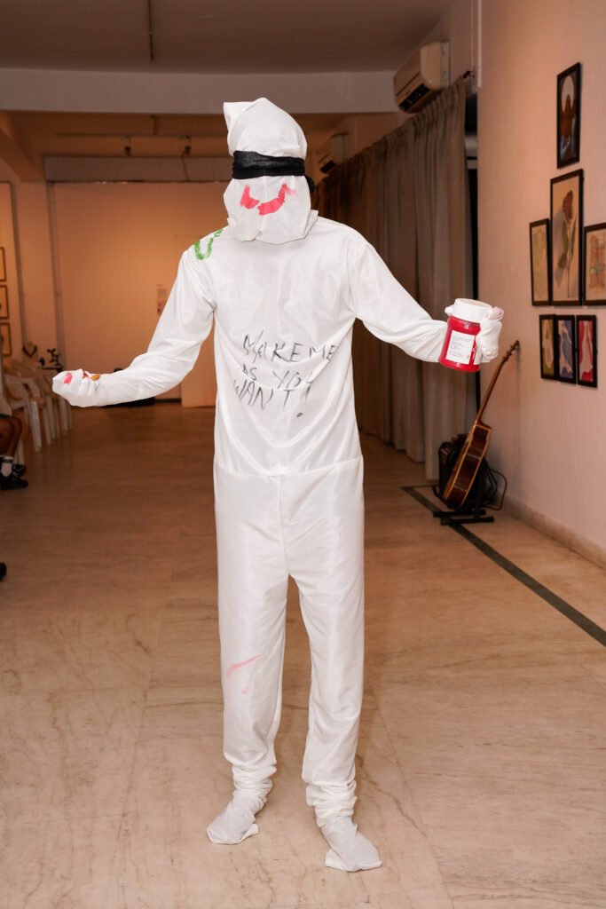Atul Bhunkal spent over seven hours in head-to-toe white cloth – performing “Trained Under Tragedy”, allowing visitors to respond to his presence in real time—an interaction that ranged from gentle marks to rougher gestures. According to the artist, the work was rooted in a deeply personal memory of being introduced, as a child, to pornography and the long, difficult process of overcoming the addiction that followed.
